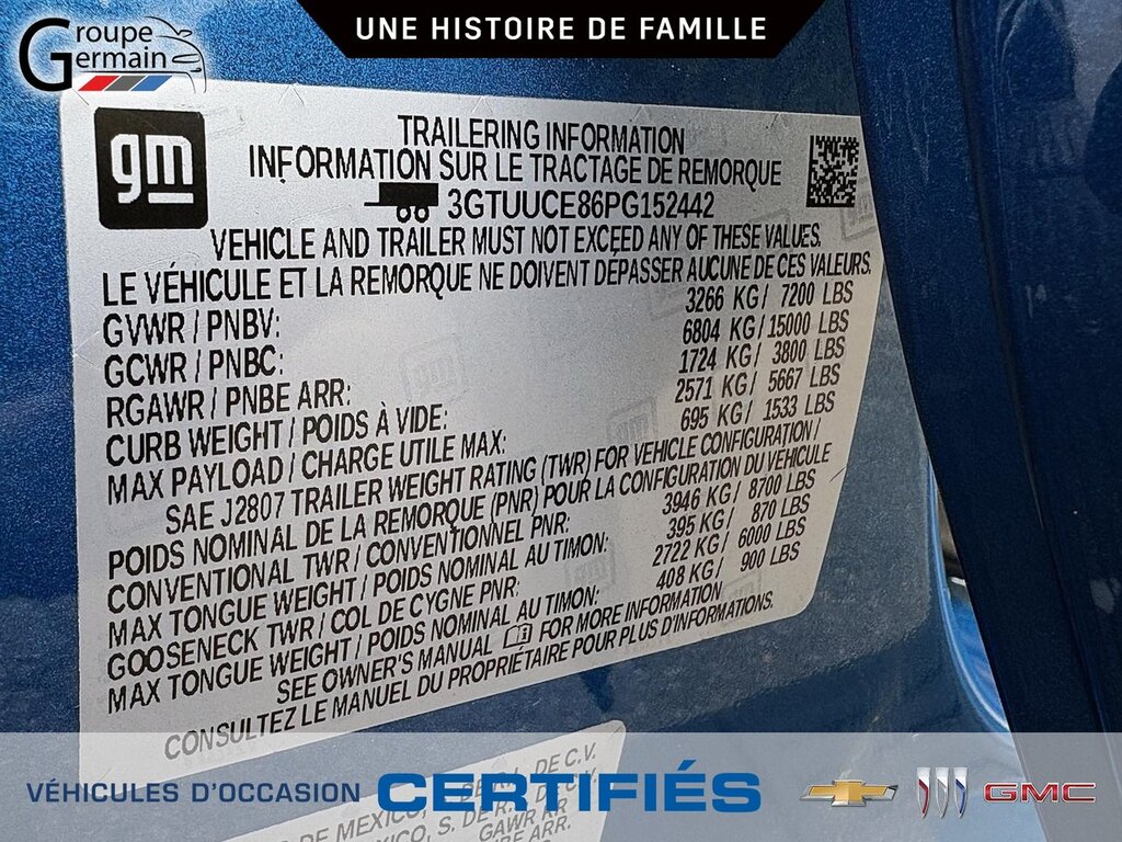 *** JAMAIS ACCIDENTÉ *** UN SEUL PROPRIÉTAIRE *** PNBV 7200 LBS Rapport Pont-Arrière de 3.23 Capacité de remorquage de 9,000 LBS Groupe remorquage, Emblemes noir, Volant et sièges chauffants, Contrôleur de frein remorque, Démarreur à distance. Il s'agit d'un véhicule Certifié. Germain Chevrolet vous protège avec une garantie améliorée à 3 mois/5000km. Le véhicule est inspecté en 155 points. Avec cette inspection, nous sommes en mesure d'améliorer la garantie légale de 1 mois 1700KM. À l'achat de votre nouveau véhicule d'occasion chez Germain Chevrolet, vous en obtenez plus... en prime une tranquilité d'esprit. TOUJOURS OUVERT LE SAMEDI DE 9H À 12H