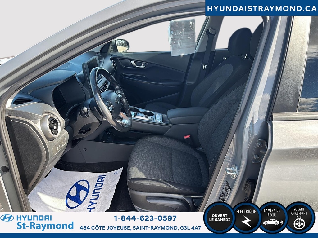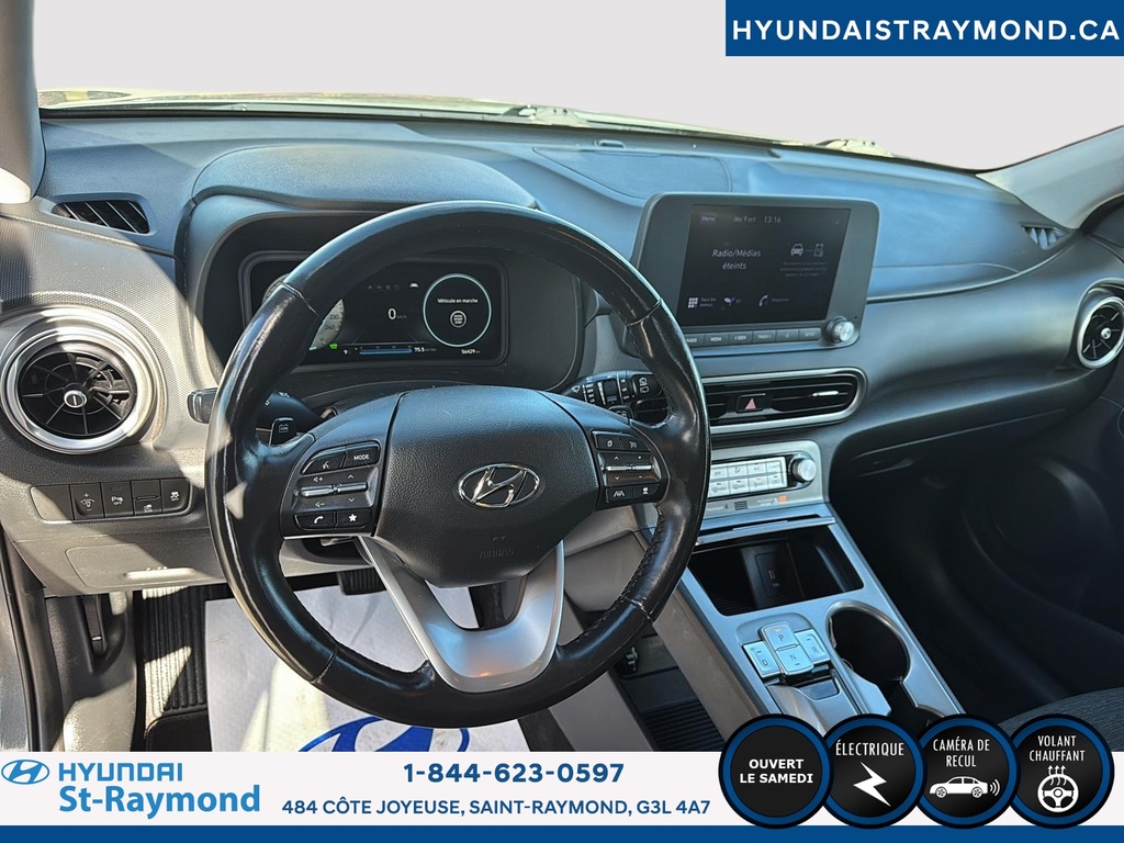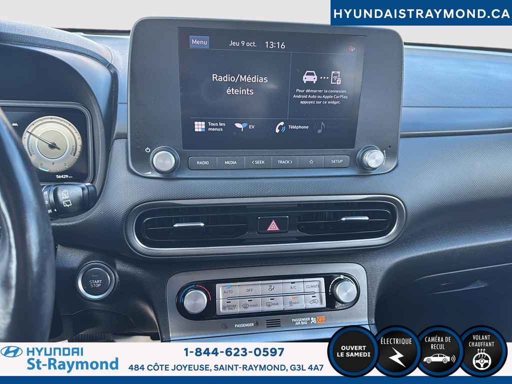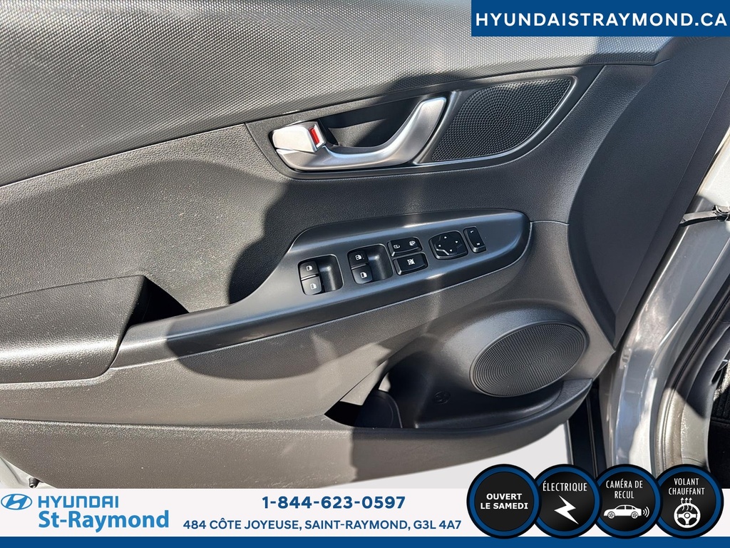 Le Hyundai Kona Electric Preferred TA 2022 est un VUS 100% électrique affichant 56 421 km. Son autonomie électrique appréciée et ses technologies de sécurité avancées en font un choix fiable pour la conduite quotidienne. Ce véhicule, couleur extérieure gris et intérieur noir, est offert chez Hyundai St-Raymond. CARACTÉRISTIQUES DU VÉHICULE ÉLECTRIQUE »» 100% électrique, sans émissions polluantes »» Autonomie estimée jusqu'à 415 km selon Ressources naturelles Canada »» Recharge possible à domicile ou borne rapide »» Fonctionnement silencieux et sans vibration CARACTÉRISTIQUES DE SÉCURITÉ AVANCÉES »» Avertissement de sortie de voie »» Caméra de recul pour stationnement facilité »» Coussins gonflables latéraux pour protection accrue »» Surveillance des angles morts PERFORMANCE ET EFFICACITÉ »» Transmission automatique pour conduite sans effort »» Accélération instantanée typique d'un véhicule électrique »» Freinage régénératif pour optimiser l'autonomie »» Faibles coûts d'entretien CONFORT »» Sièges avant chauffants »» Démarrage par bouton-poussoir »» Rétroviseurs extérieurs chauffants »» Climatisation automatique TECHNOLOGIE ET CONNECTIVITÉ »» Intégration Bluetooth pour appels mains libres »» Système audio compatible avec appareils mobiles »» Écran central tactile intuitif »» Commandes audio au volant ESPACE DE CHARGEMENT »» Coffre arrière pratique pour usage quotidien »» Banquette arrière rabattable pour espace flexible »» Accès facile grâce aux 4 portes »» Espace optimisé pour passagers et bagages APPRÉCIÉ DES AUTRES PROPRIÉTAIRES »» Autonomie électrique fiable au quotidien »» Conduite silencieuse et agréable »» Facilité d'utilisation des technologies »» Coûts d'utilisation réduits GARANTIE Garantie originale du manufacturier: 23 Février 2027 ou 100000 Km Le NIV de ce Hyundai Kona Electric Preferred TA 2022 est le KM8K23AG4NU149491.
